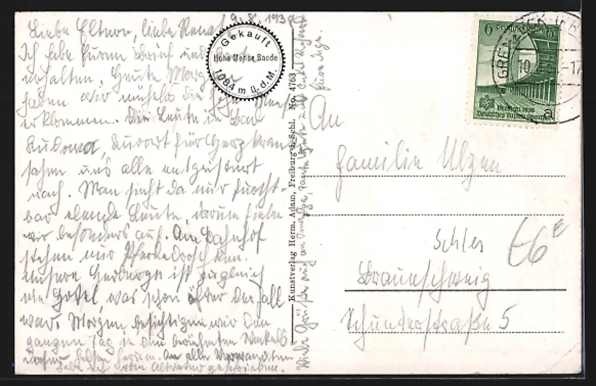 Personenbezogene Daten auf der Rückseite der Karte wurden durch blauen Textmarker unkenntlich gemacht. Die blauen Stellen sind auf die Vorderseite durchgeweicht und wirken sich negativ auf das Postkartenfoto aus