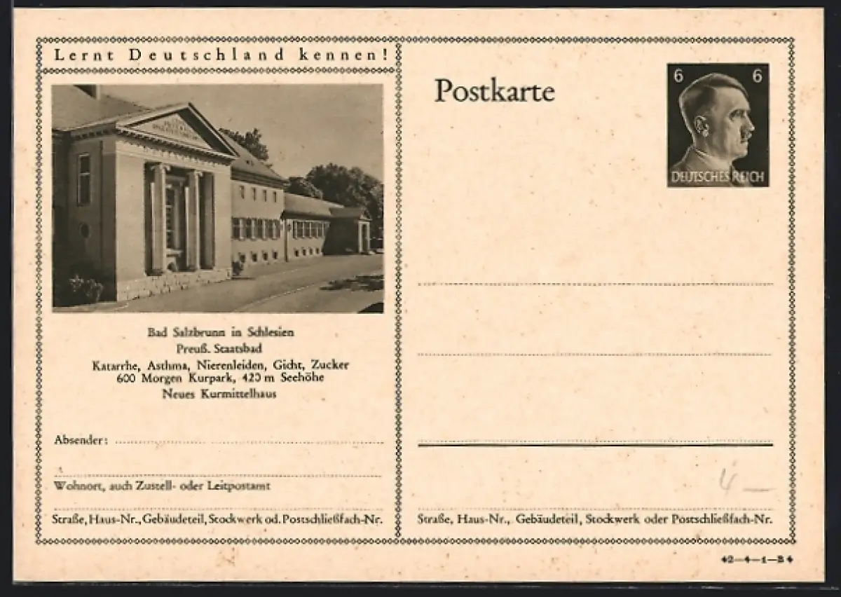 AK Bad Salzbrunn in Schlesien, Partie am Preussischen Staatsbad, Ganzsache Lernt Deutschland kennen