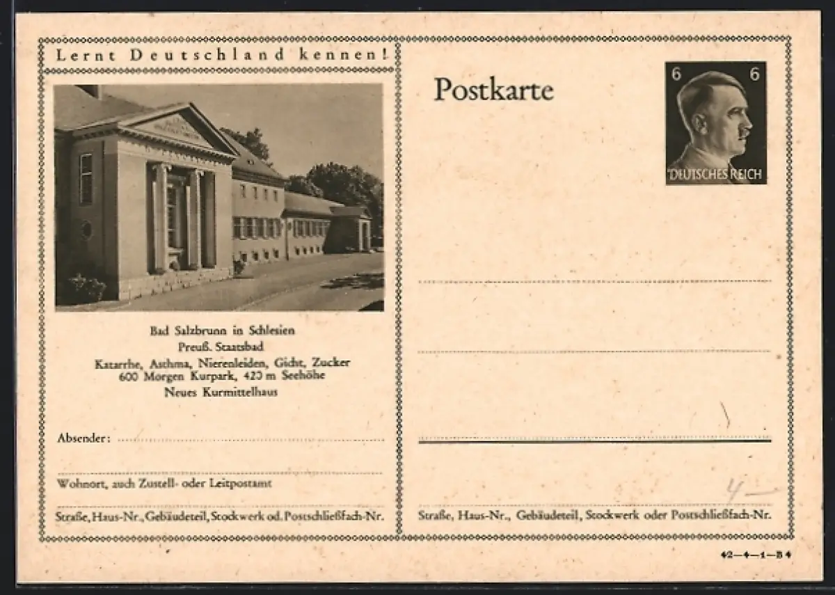 AK Bad Salzbrunn in Schlesien, Partie am Preussischen Staatsbad, Ganzsache Lernt Deutschland kennen
