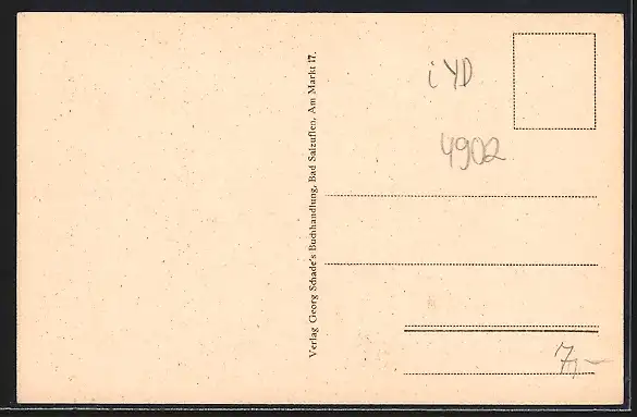 Personenbezogene Daten auf der Rückseite der Karte wurden durch blauen Textmarker unkenntlich gemacht. Die blauen Stellen sind auf die Vorderseite durchgeweicht und wirken sich negativ auf das Postkartenfoto aus