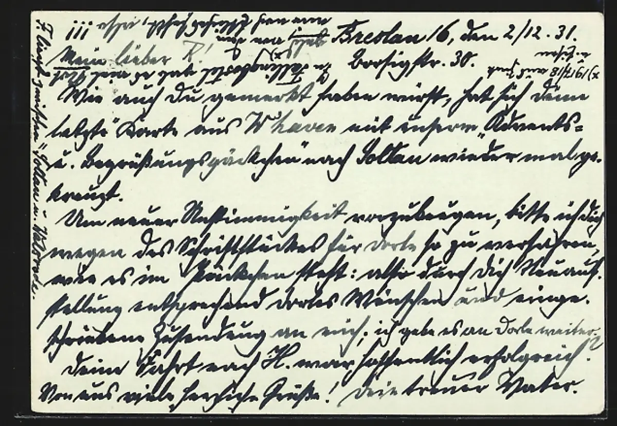 Personenbezogene Daten auf der Rückseite der Karte wurden durch blauen Textmarker unkenntlich gemacht. Die blauen Stellen sind auf die Vorderseite durchgeweicht und wirken sich negativ auf das Postkartenfoto aus