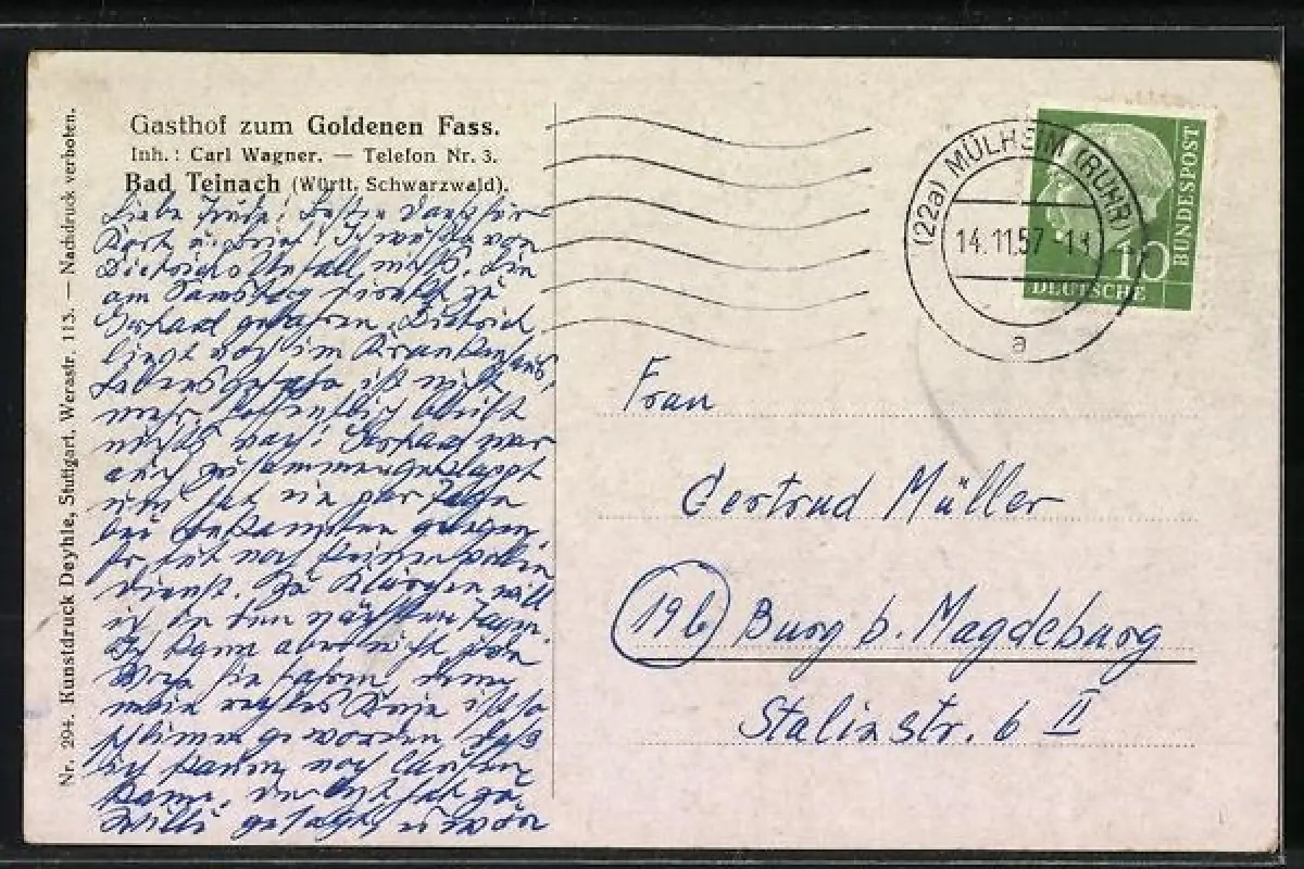 AK Bad Teinach /Württ. Schwarzwald, Gasthof zum Goldenen Fass Carl Wagner
