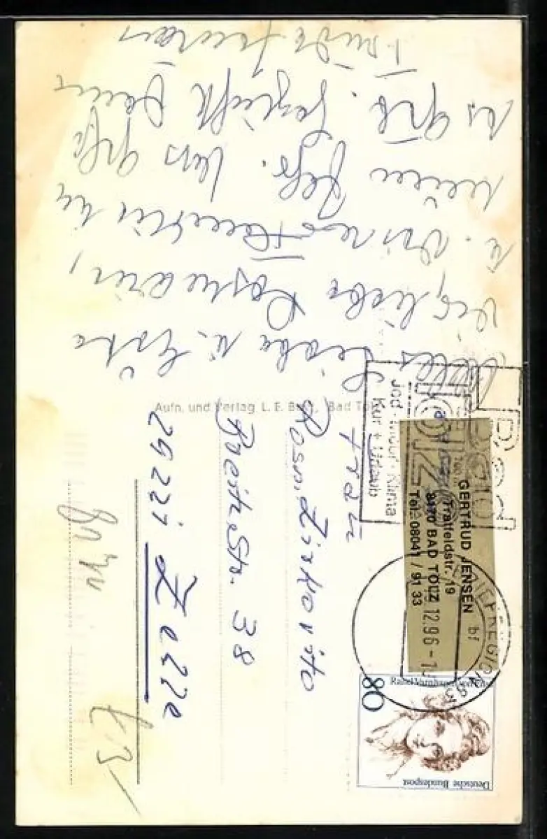 alte Ansichtskarte, gelaufen 1996, rückseitig Klebe- und Papierreste, guter Zustand