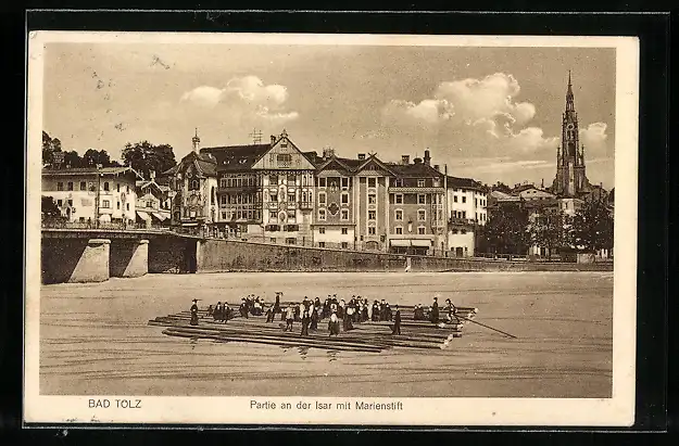AK Bad Tölz, Flösser unterwegs auf der Isar, im Hintergrund Marienstift, Forstwirtschaft
