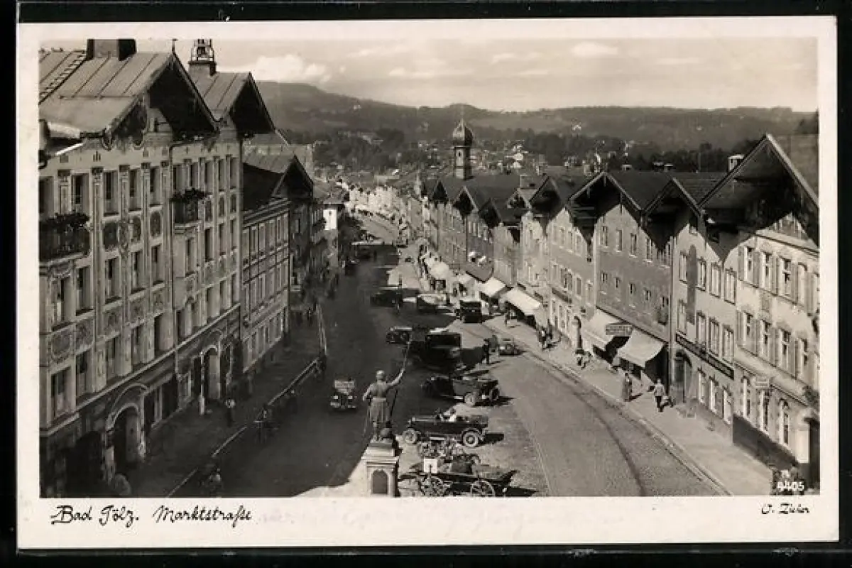 AK Bad Tölz, Marktstrasse aus der Vogelschau, mit Denkmal
