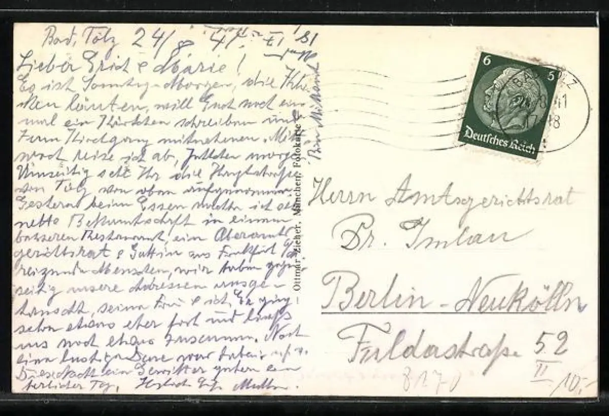Personenbezogene Daten auf der Rückseite der Karte wurden durch blauen Textmarker unkenntlich gemacht. Die blauen Stellen sind auf die Vorderseite durchgeweicht und wirken sich negativ auf das Postkartenfoto aus