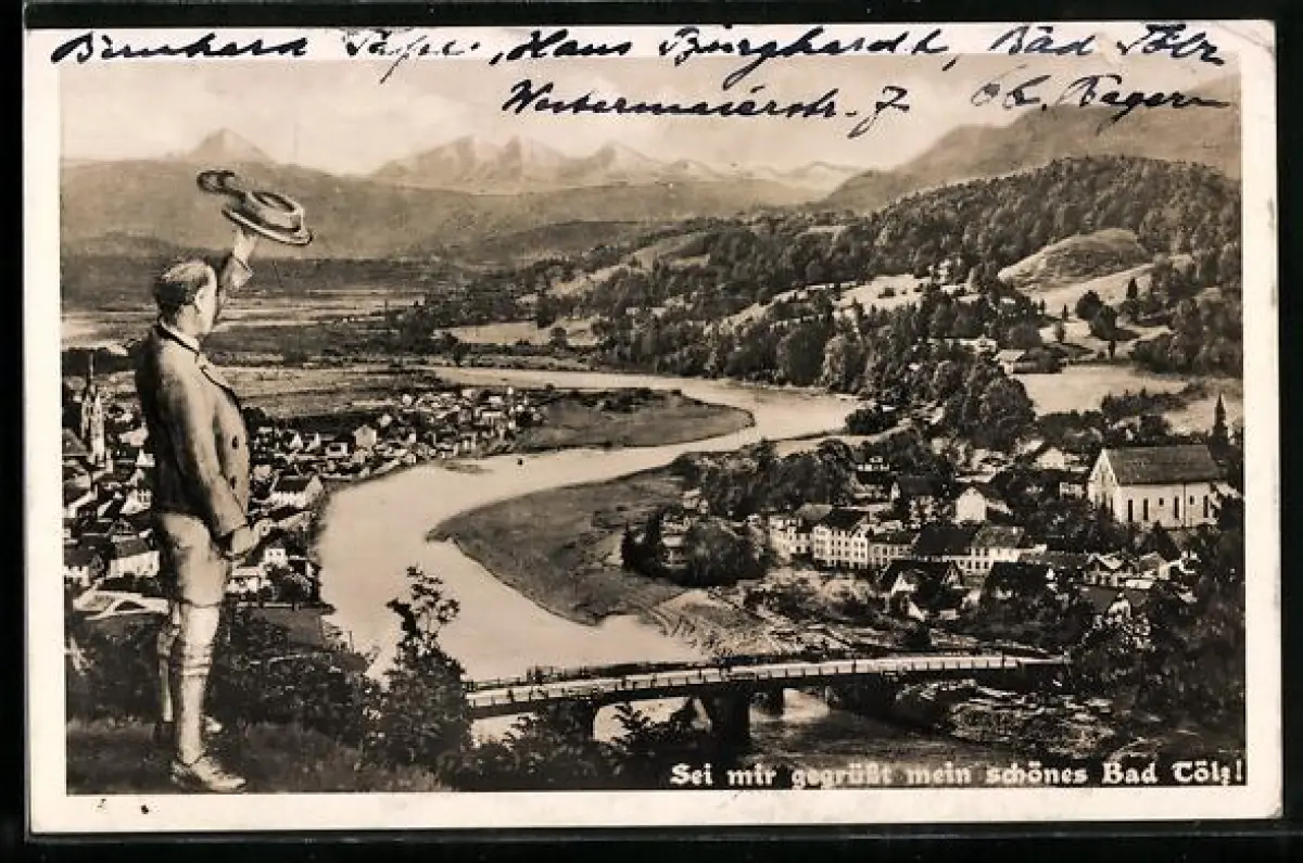 AK Bad Tölz, Panorama mit Isarbrücke und Kirche