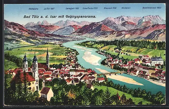 AK Bad Tölz, Totalansicht mit Gebirgspanorama und Blick auf die Isar