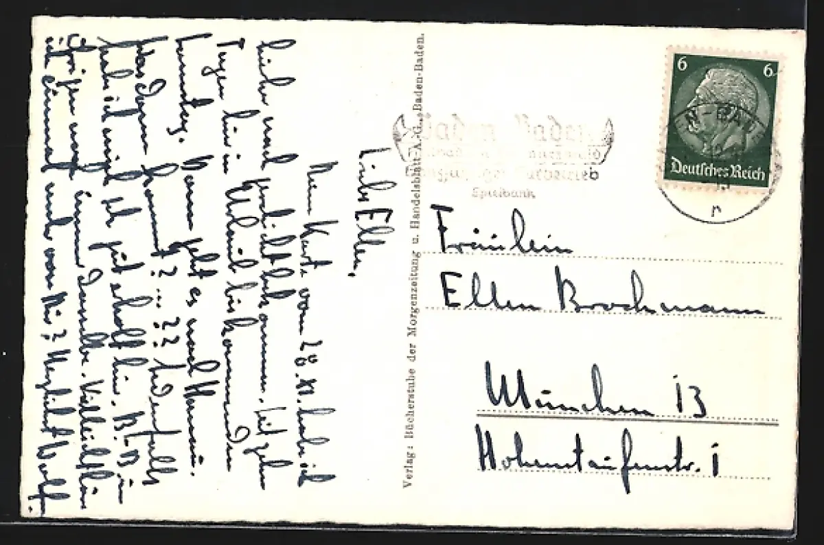 Personenbezogene Daten auf der Rückseite der Karte wurden durch blauen Textmarker unkenntlich gemacht. Die blauen Stellen sind auf die Vorderseite durchgeweicht und wirken sich negativ auf das Postkartenfoto aus