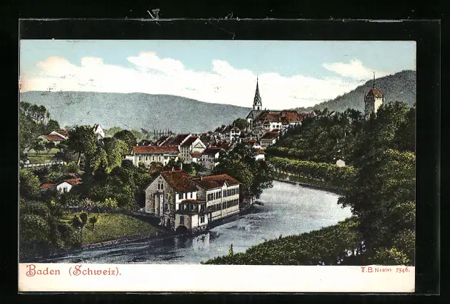 AK Baden, Ortsansicht und Flusspartie aus der Vogelschau