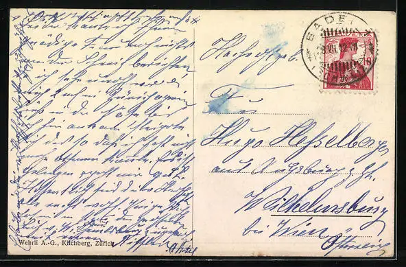Personenbezogene Daten auf der Rückseite der Karte wurden durch blauen Textmarker unkenntlich gemacht. Die blauen Stellen sind auf die Vorderseite durchgeweicht und wirken sich negativ auf das Postkartenfoto aus
