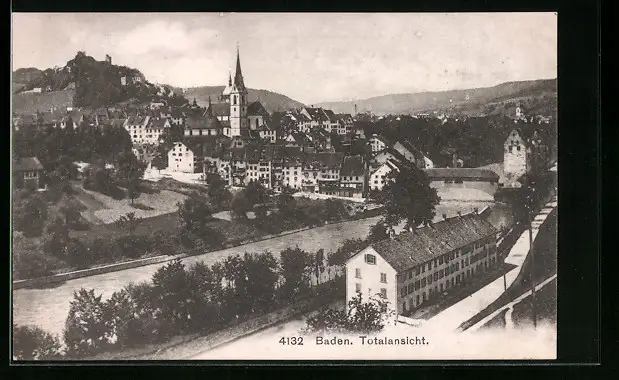 AK Baden, Totalansicht mit Uferstrasse aus der Vogelschau