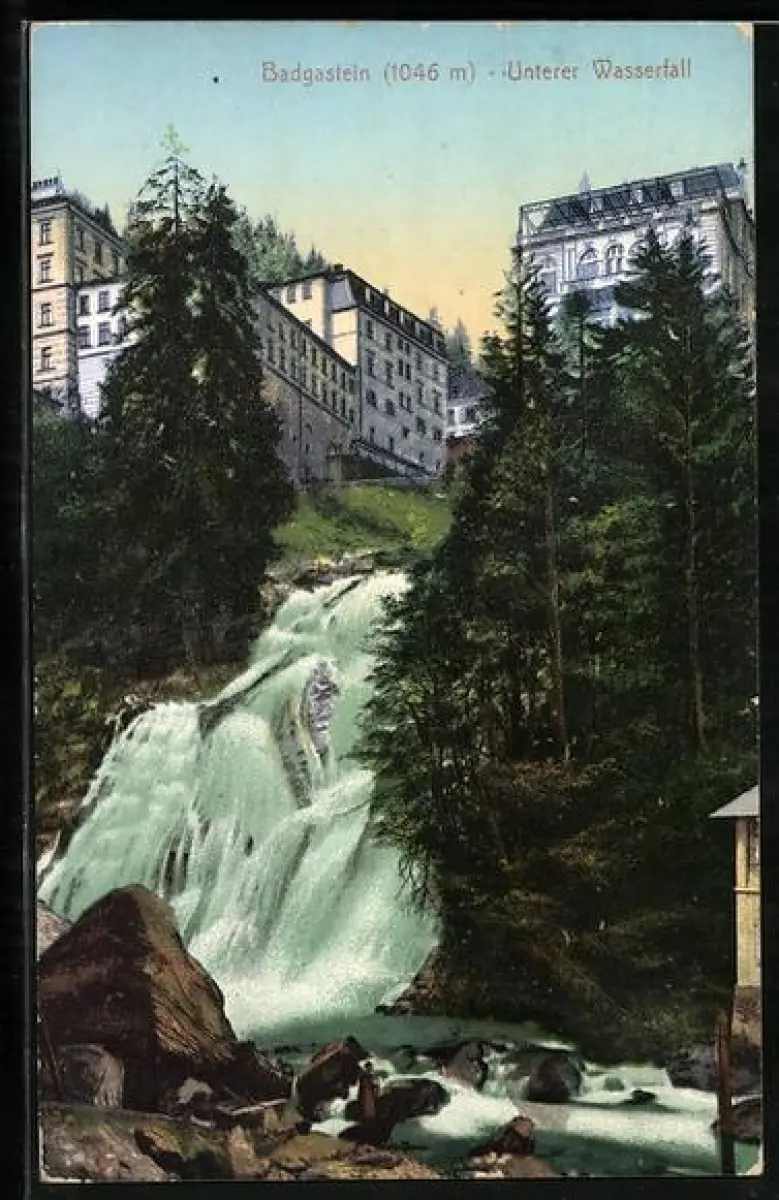 AK Badgastein, Unterer Wasserfall mit nahestehenden Häusern