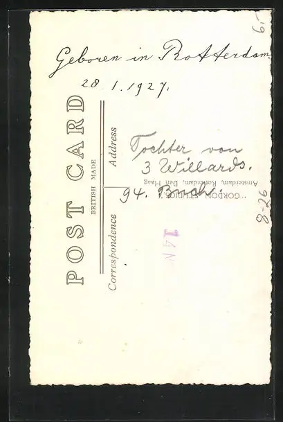 Personenbezogene Daten auf der Rückseite der Karte wurden durch blauen Textmarker unkenntlich gemacht. Die blauen Stellen sind auf die Vorderseite durchgeweicht und wirken sich negativ auf das Postkartenfoto aus