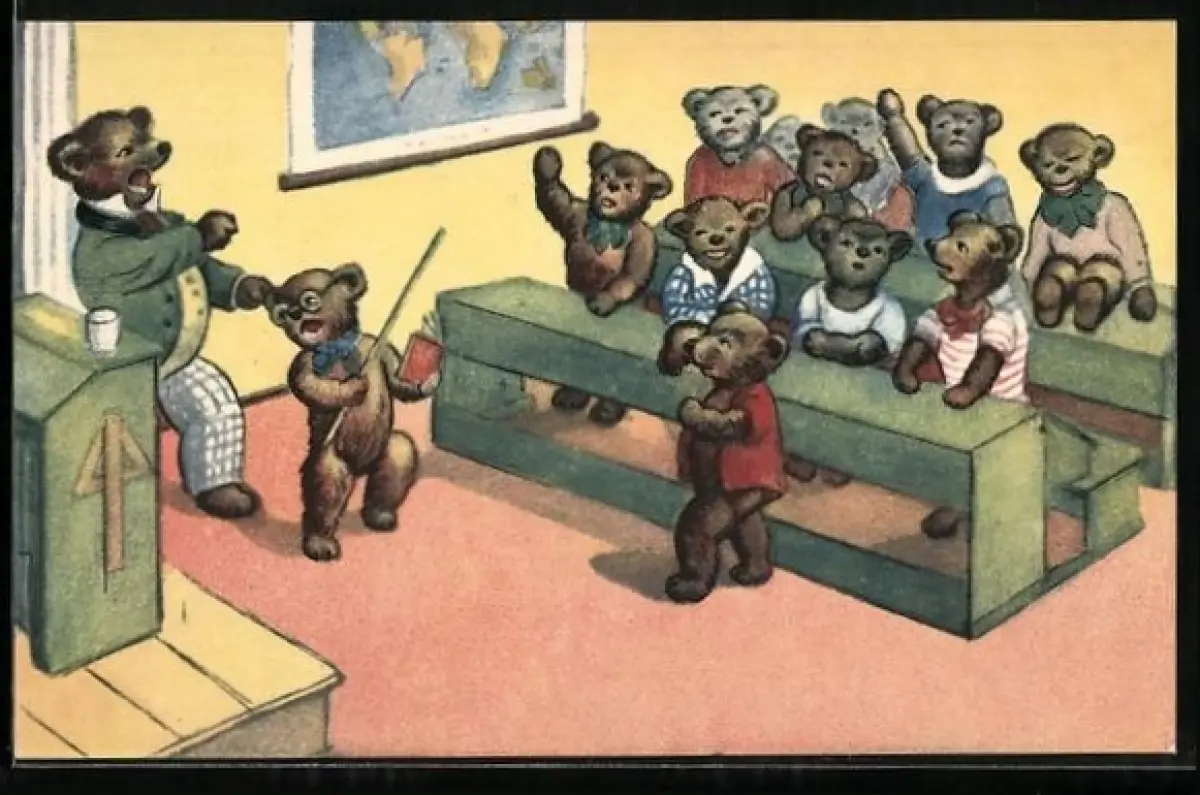 AK Bären in der Schule, Lehrer zieht einem Bären an den Ohren