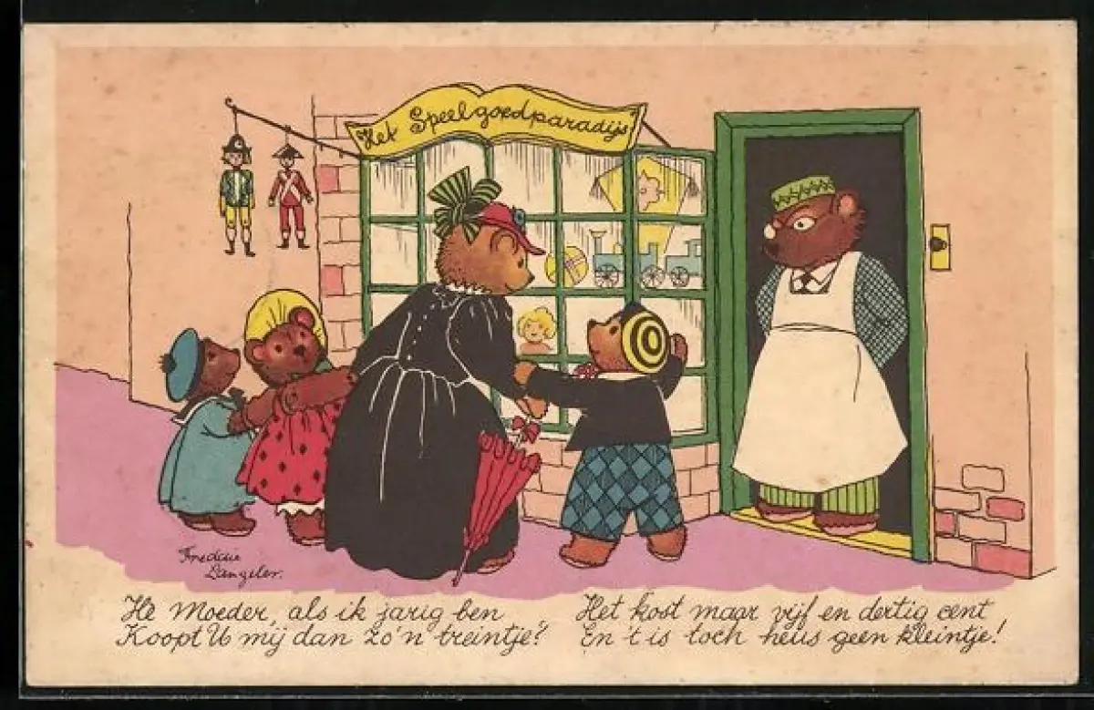 AK Bärenmutter mit Kindern vor dem Spielwarengeschäft, vermenschlichte Tiere