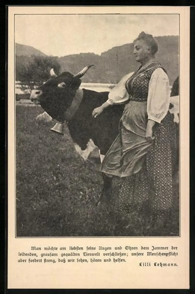 AK Bäuerin mit Kuh, Tierschutz-Zitat nach Lilli Lehmann