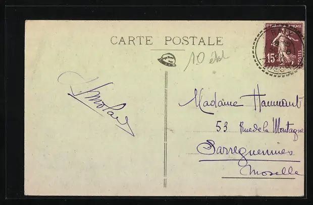 Personenbezogene Daten auf der Rückseite der Karte wurden durch blauen Textmarker unkenntlich gemacht. Die blauen Stellen sind auf die Vorderseite durchgeweicht und wirken sich negativ auf das Postkartenfoto aus