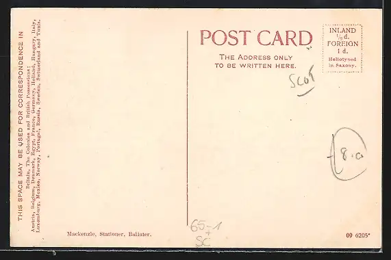 Personenbezogene Daten auf der Rückseite der Karte wurden durch blauen Textmarker unkenntlich gemacht. Die blauen Stellen sind auf die Vorderseite durchgeweicht und wirken sich negativ auf das Postkartenfoto aus