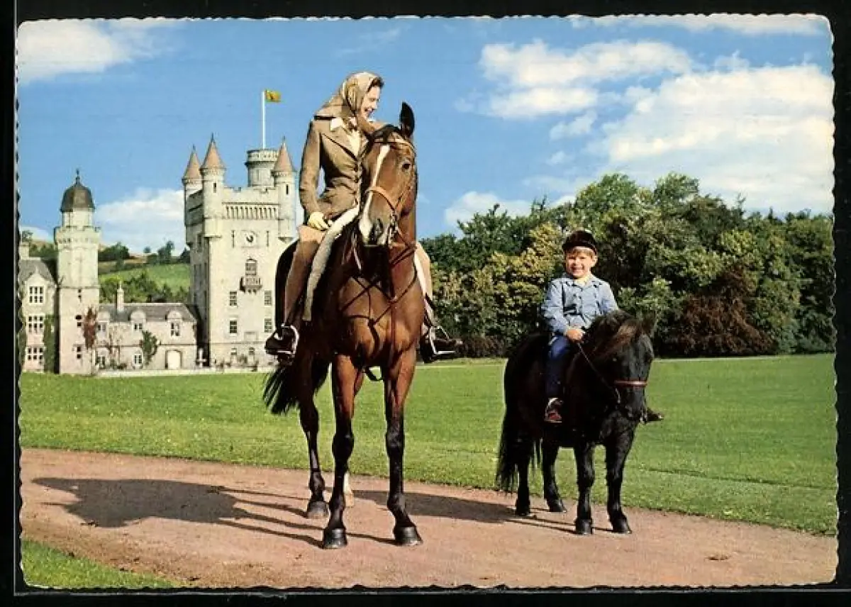 AK Balmoral, Elisabeth II., Königin von England mit Prinz Andrew bei Ausritt