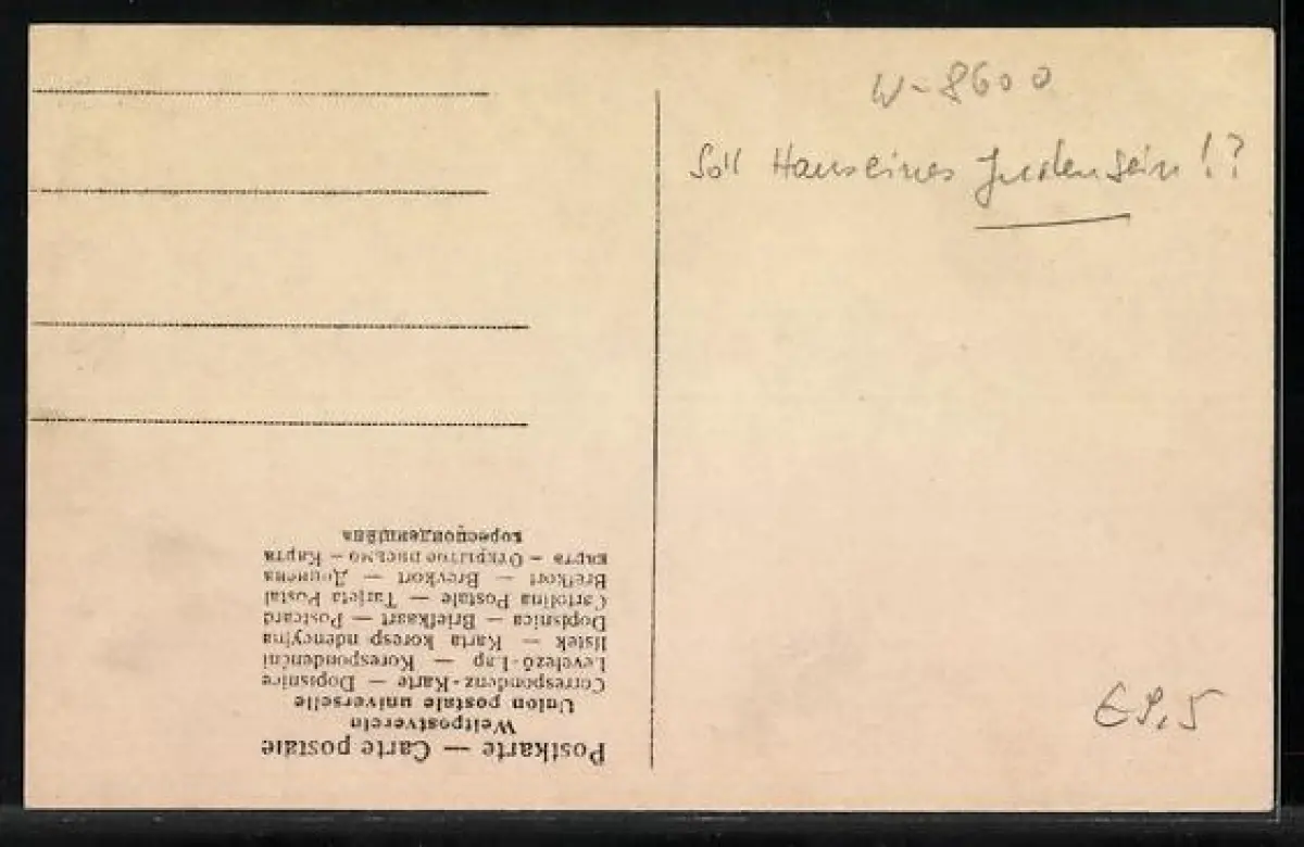 Personenbezogene Daten auf der Rückseite der Karte wurden durch blauen Textmarker unkenntlich gemacht. Die blauen Stellen sind auf die Vorderseite durchgeweicht und wirken sich negativ auf das Postkartenfoto aus