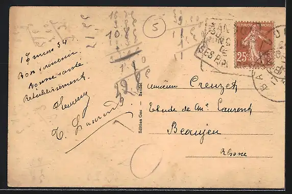 Personenbezogene Daten auf der Rückseite der Karte wurden durch blauen Textmarker unkenntlich gemacht. Die blauen Stellen sind auf die Vorderseite durchgeweicht und wirken sich negativ auf das Postkartenfoto aus