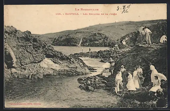 AK Banyuls, Les rochers de la Jetée avec des promeneurs en tenue estivale