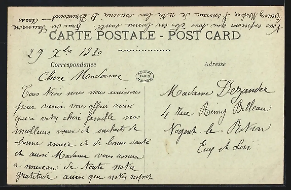 Personenbezogene Daten auf der Rückseite der Karte wurden durch blauen Textmarker unkenntlich gemacht. Die blauen Stellen sind auf die Vorderseite durchgeweicht und wirken sich negativ auf das Postkartenfoto aus