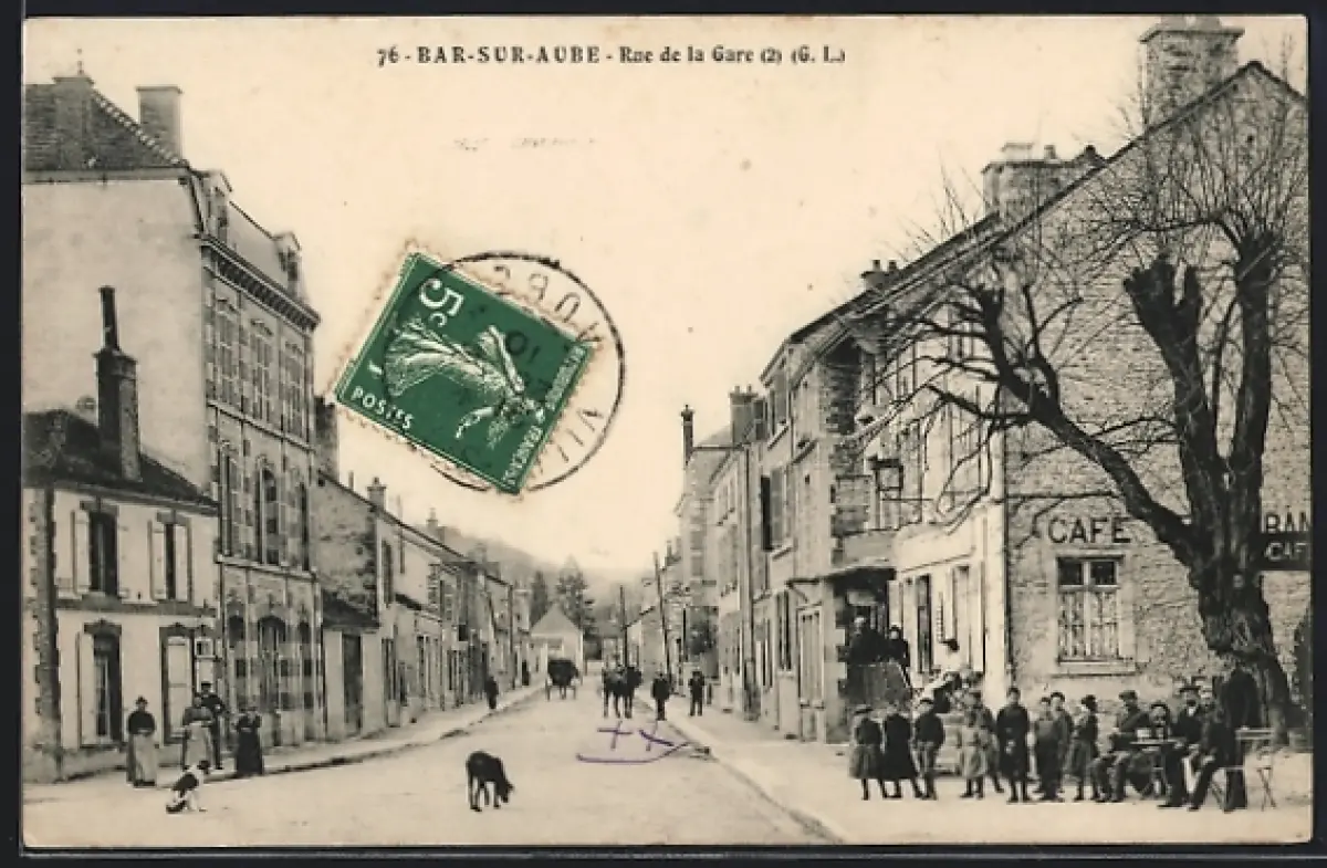 AK Bar-sur-Aube, Rue de la Gare avec passants et café animés
