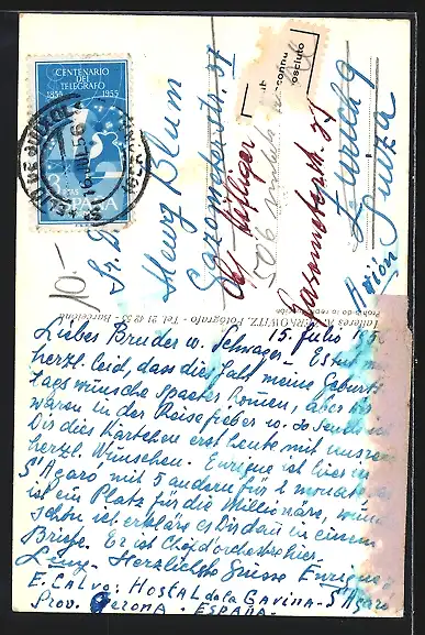 Personenbezogene Daten auf der Rückseite der Karte wurden durch blauen Textmarker unkenntlich gemacht. Die blauen Stellen sind auf die Vorderseite durchgeweicht und wirken sich negativ auf das Postkartenfoto aus