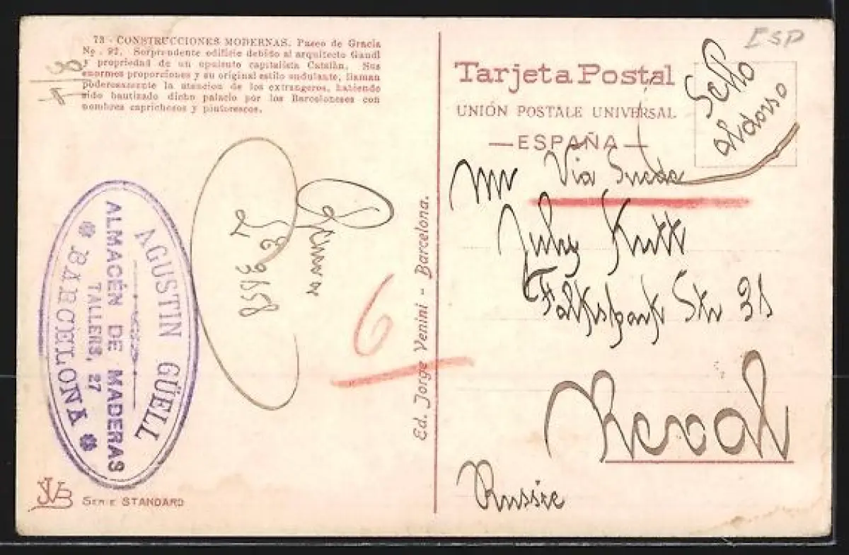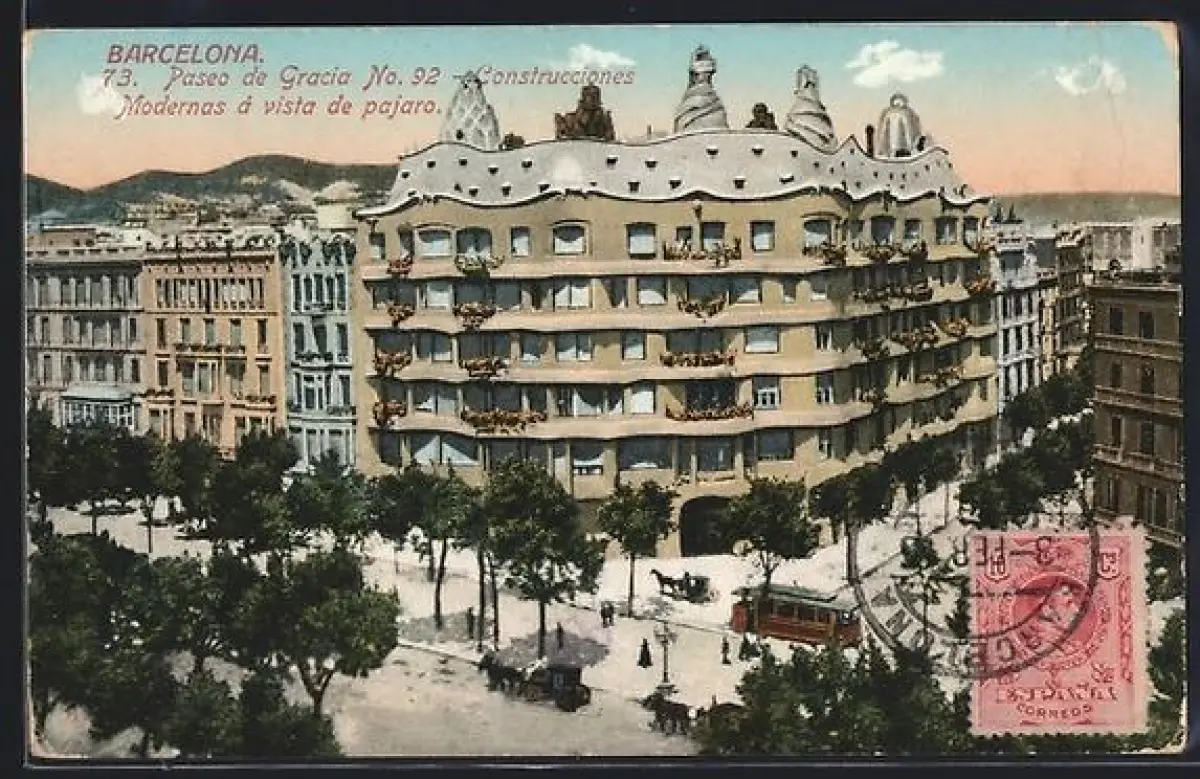 AK Barcelona, Paseo de Gracia No. 92, Construcciones Modernas a vista de pajaro, Strassenbahn