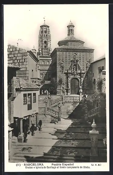 AK Barcelona, Puebio Espanol, Gradas e Iglesia al fondo campanario de Utebo