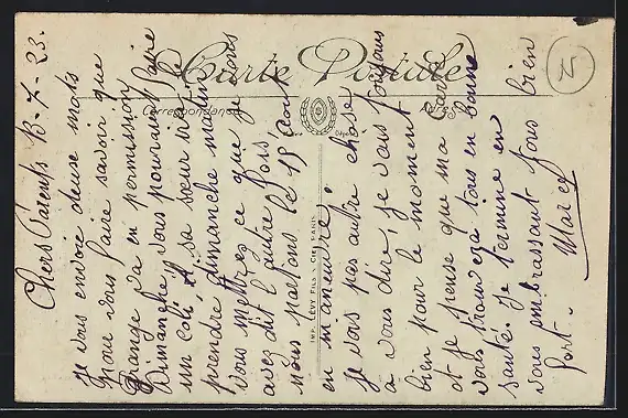 Personenbezogene Daten auf der Rückseite der Karte wurden durch blauen Textmarker unkenntlich gemacht. Die blauen Stellen sind auf die Vorderseite durchgeweicht und wirken sich negativ auf das Postkartenfoto aus
