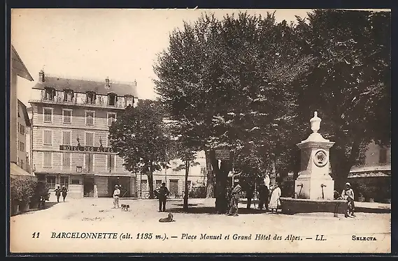 AK Barcelonnette, Place Manuel et Grand Hotel des Alpes