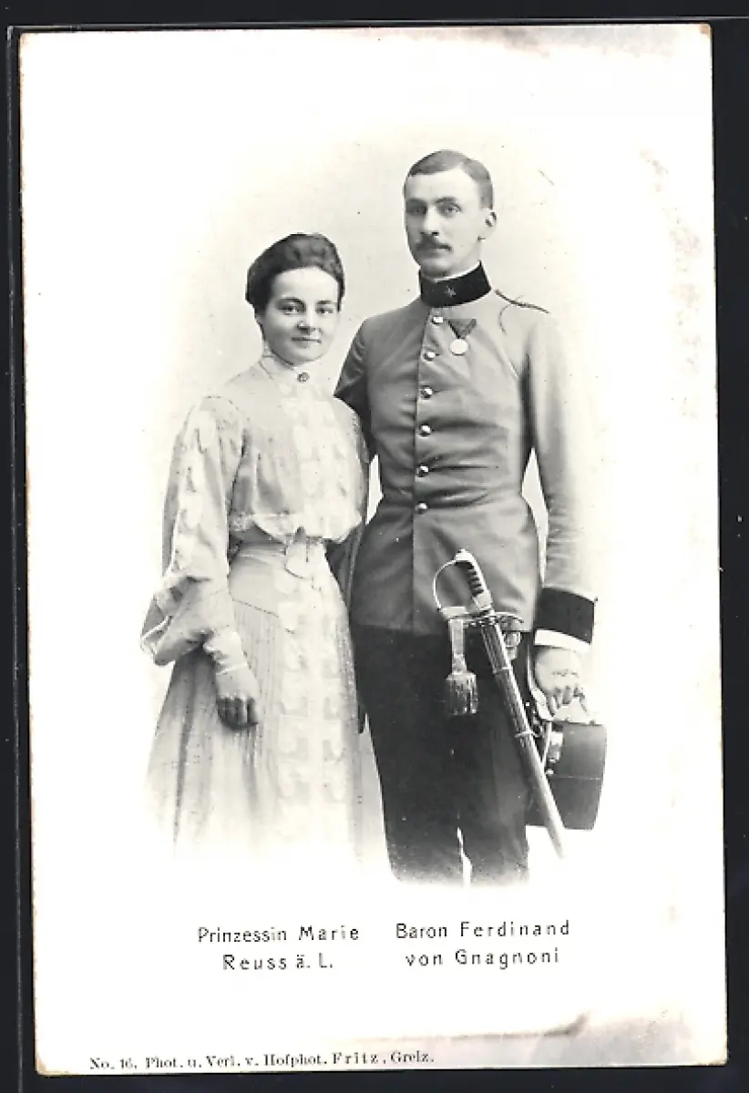 AK Baron Ferdinand von Gnagnoni in Uniform mit Säbel, Prinzessin Marie Reuss ä. L.