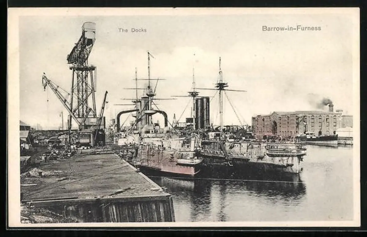 AK Barrow-in-Furness, The Docks, two battleships at the pier