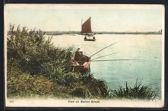 AK Barton Broad, Uferpartie mit Anglern und Booten