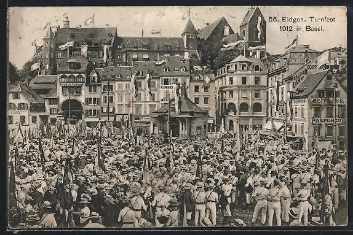 AK Basel, 56. Eidgen. Turnfest 1912, Turner auf dem Platz am Hotel zum Stadthof