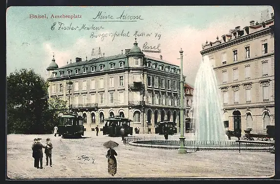 AK Basel, Aeschenplatz, Strassenbahn, Fontäne