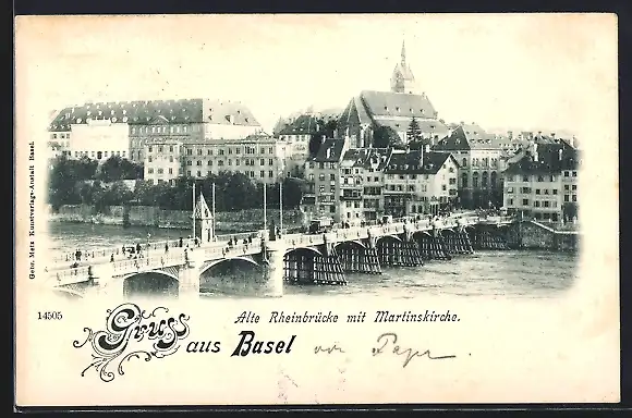 AK Basel, Alte Rheinbrücke mit Martinskirche