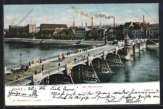 AK Basel, Alte Rheinbrücke, um 1900, Strassenbahn