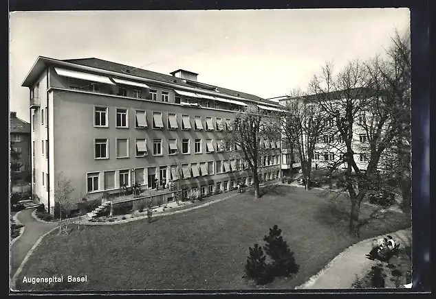 AK Basel, Augenspital mit Gartenanlage und Besuchern auf Parkbank