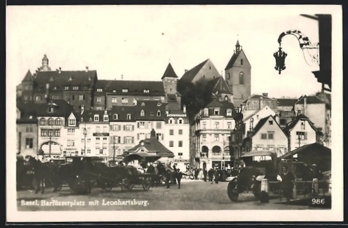 AK Basel, Barfüsserplatz mit Leonhartsburg