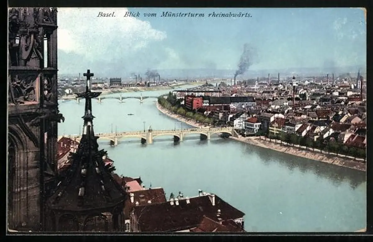 AK Basel, Blick vom Münsterturm rheinabwärts