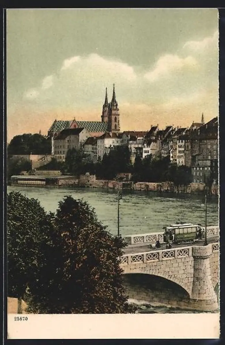 AK Basel, Brücke mit Strassenbahn, Im Hintergrund Kirche