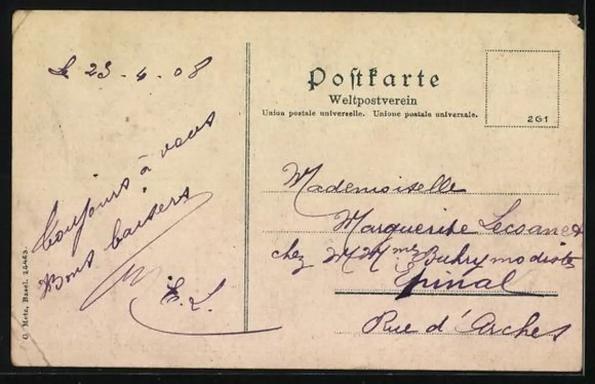 alte Ansichtskarte, gelaufen 1908, Bugspur unten links, Eckknick unten rechts und oben rechts