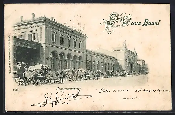 AK Basel, Centralbahnhof mit Fuhrwerken und Strasse