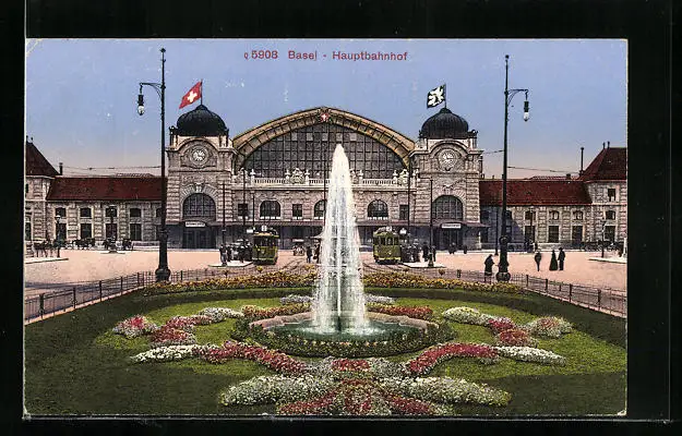 AK Basel, Hauptbahnhof mit Springbrunnen