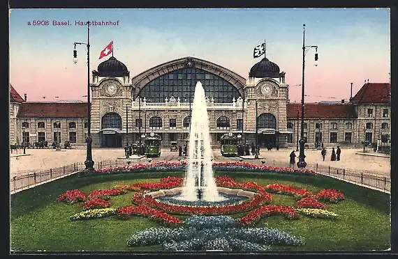 AK Basel, Hauptbahnhof mit Springbrunnen