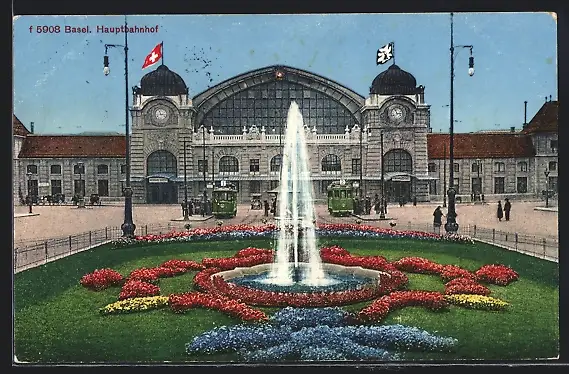 AK Basel, Hauptbahnhof mit Strassenbahn und Springbrunnen